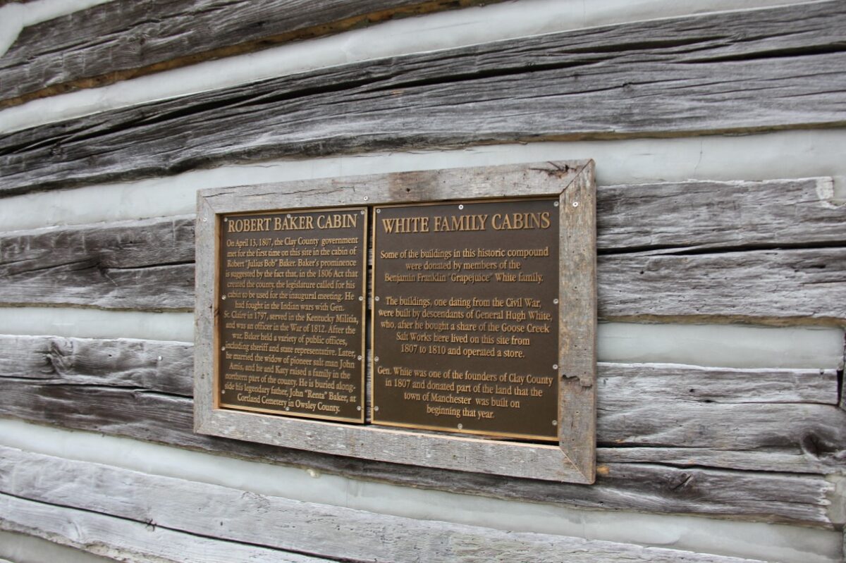 - Jesse Cotton Cabin — The centerpiece structure, estimated to be 175 to 220 years old. It stands in for Robert Baker’s cabin, which hosted the first county government in 1807.